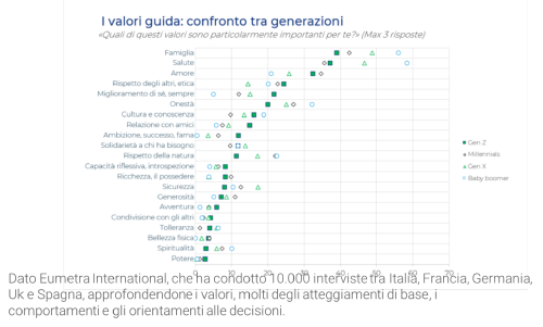 Questo complesso scenario è pienamente confermato dalla ricerca sui valori, condotta da Eumetra International, che ha intervistato 10.000 persone tra Italia, Francia, Germania, Inghilterra e Spagna. Lo scopo era comprendere come le 4 generazioni si differenziassero per valori, atteggiamenti ed elementi su cui basare le proprie scelte.
